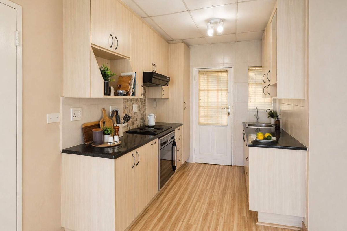 Located in a sought-after retirement village the unit has 2 bedrooms and a bathroom with shower, toilet, and basin. Both bedrooms have laminated floors and built-in cupboards and are able to accommodate a double bed. The spacious lounge / dining room has a beautiful sunny bay window and is open plan to the kitchen, both with laminated floors. The kitchen has granite tops, sufficient cupboard space, electric hob, undercounter oven, space for a fridge / freezer and a door leading to the paved courtyard that has a washing line and a Wendy house. The single garage has been converted to a second living room with a ceiling fan and tiled floor, leading to the separate scullery. The scullery has double basin, built in cupboards and space for a washing machine, also with door leading to the rear courtyard.