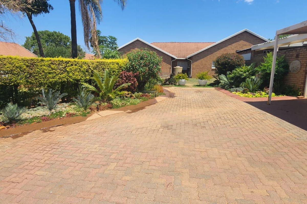 Welcoming Exterior: A beautifully maintained garden and paved driveway lead to double carports in front of the house.