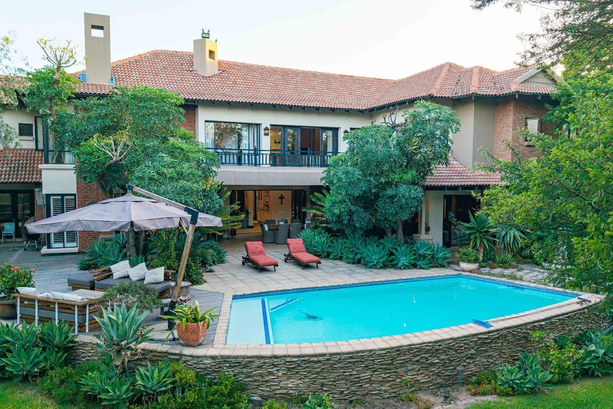 Country-living entertainer's retreat in Midrand countryside, framed by mature trees and a fruit orchard. Alfresco patio with pizza oven, pool; six bedrooms plus separate two-bed cottage and five garages.