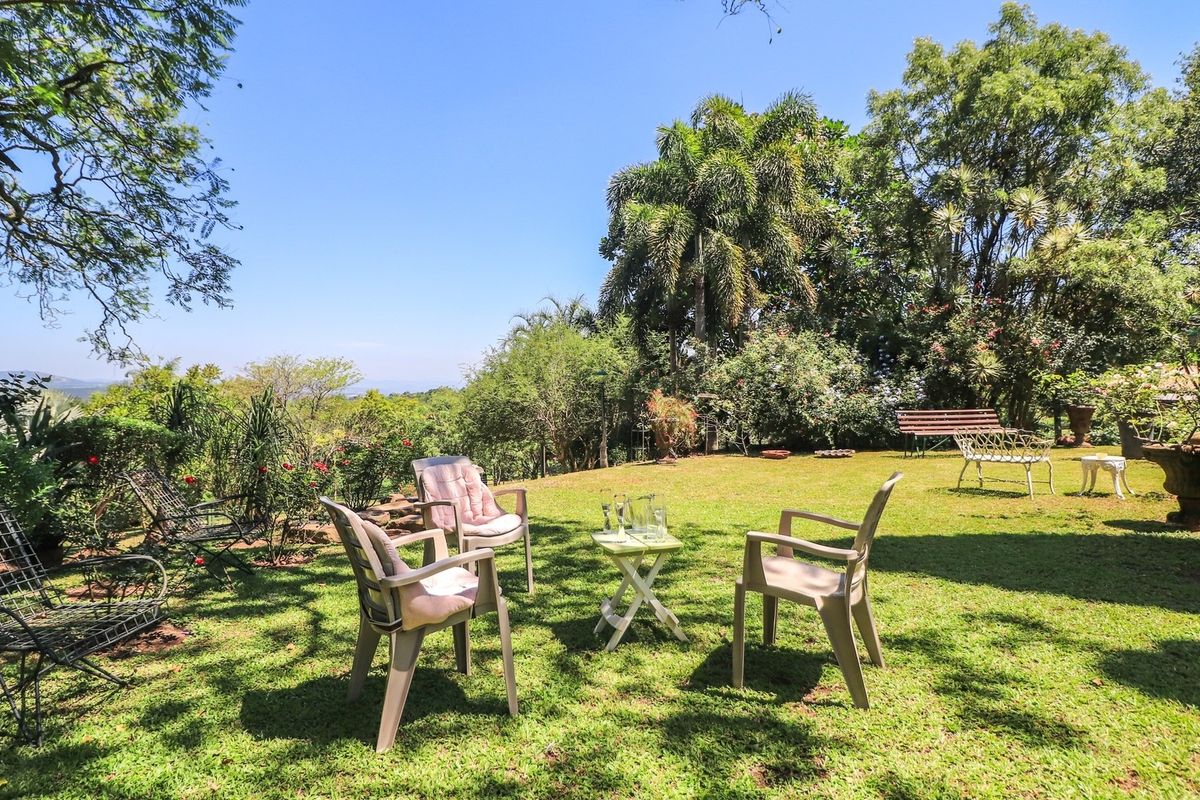 A carport can accommodate six vehicles. The gardens are filled with various bird species and feature a rare, colorful landscape. Small duikers can often be seen wandering about. The outdoor space allows for stunning views, particularly when seated under the shade of large, mature trees. Please note there is no pool or solar power installed. This beautiful garden is a haven for diverse birdlife.