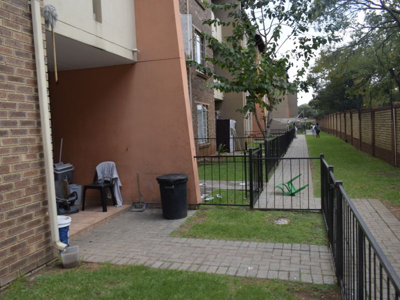 Relax after work in this ground-floor Comet apartment with a private garden patio and communal braai, playground and 24-hour security — two bedrooms, one bathroom, covered parking.