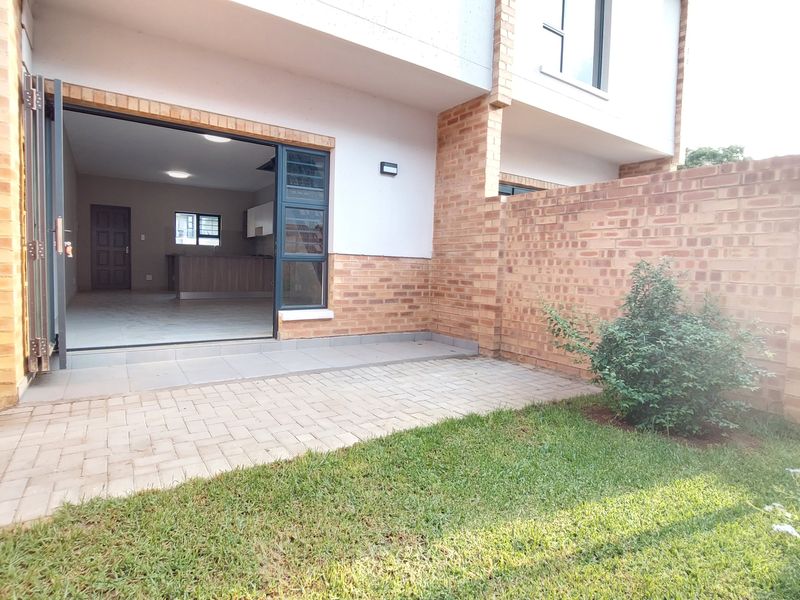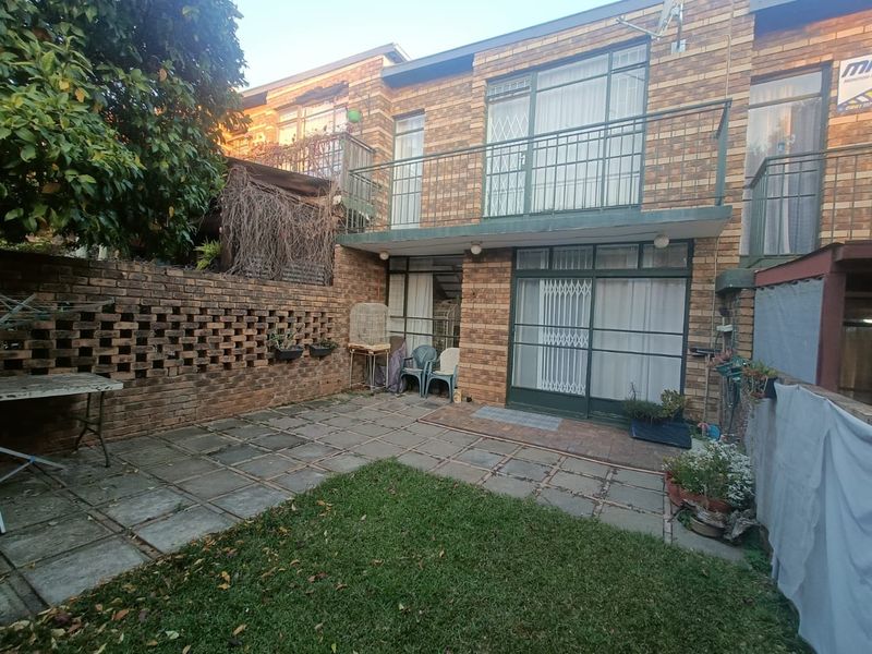 Entertainer's top-floor townhouse with large undercover patio and built-in braai, set in a secure complex near Unitas Hospital; open-plan kitchen, three bedrooms, two baths, garage.