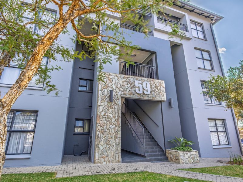 Sun-soaked, easygoing living with open-plan flow onto a private balcony, clubhouse with pool, and Gautrain bus at the gate — two bedrooms, two bathrooms, near schools and shopping.