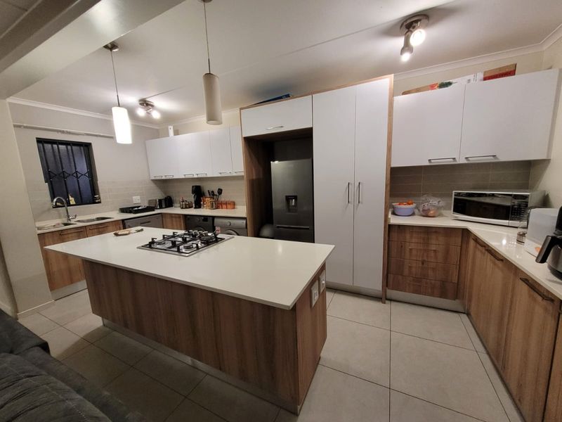 Relaxed family living in secure Red Ivory Lane, Modderfontein — easy access to malls and nature reserve. North-facing covered patio with garden and modern kitchen; three bedrooms, two bathrooms.