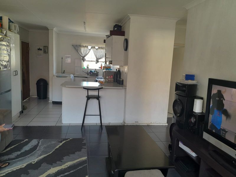 Bright first-floor townhouse in central Vorna Valley, near Waterfall Ridge and Mall of Africa, with a breakfast-bar kitchen, sunlit lounge and balcony, communal pool, 2 beds, 1 bath, covered parking.