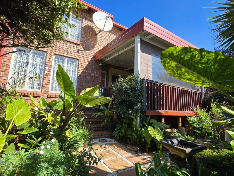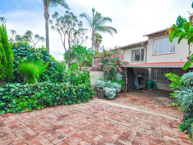 Relaxed family living steps from Constantia Park Primary, Medicross and Woodstock Pizzeria — renovated two-bedroom, two-bath duplex with tiled open-plan living, covered patio and established garden; secure carport.