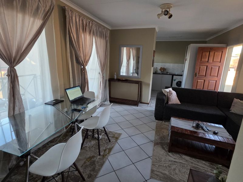 Relaxed suburban living in Magalieskruin, steps from malls, schools and hospitals. Open-plan lounge leads to a balcony with built-in braai; two bedrooms, one bath and covered parking.