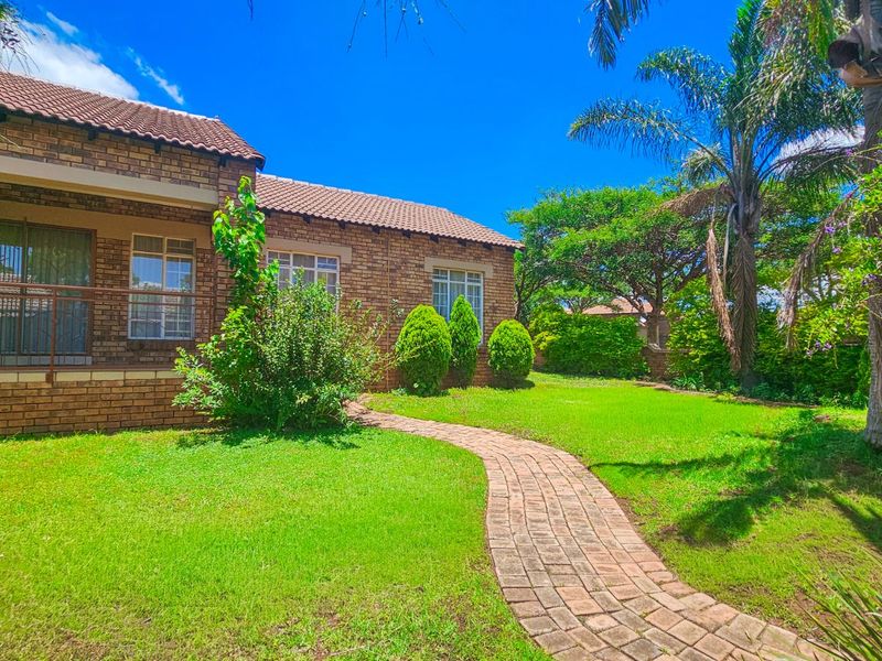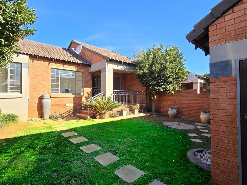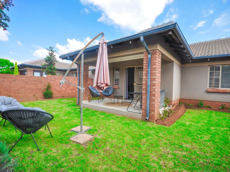 Resort-style living in Mooikloof Ridge Estate with pools, courts and walkways near Woodlands Boulevard; sunny unit with private garden and covered patio, two bedrooms, two bathrooms and double garage.