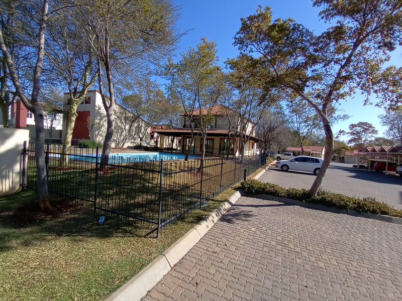 Low-maintenance, secure living in Oukraal Estate with quick N4 access and nearby shops; ground-floor bachelor offers a private patio overlooking communal gardens, granite kitchenette, built-in storage.