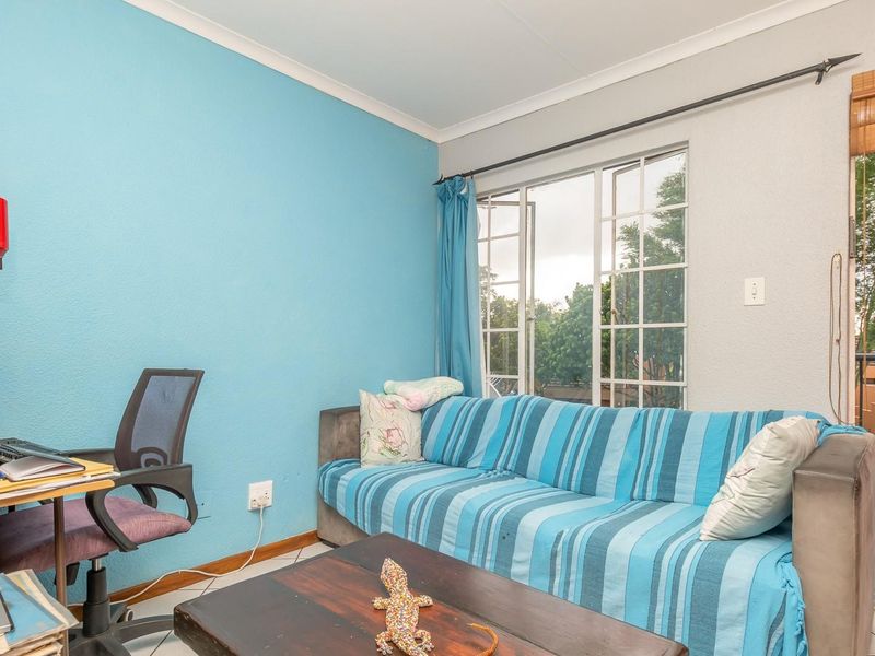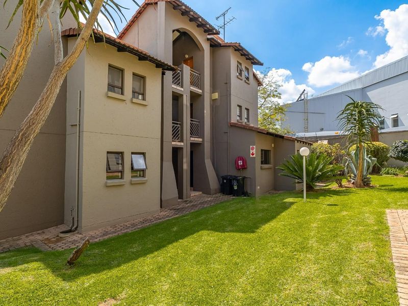 Resort-style estate living in Maroeladal — secure, relaxed lifestyle with easy access to Fourways amenities; ground-floor apartment opens onto manicured communal gardens, one bedroom, one bath.