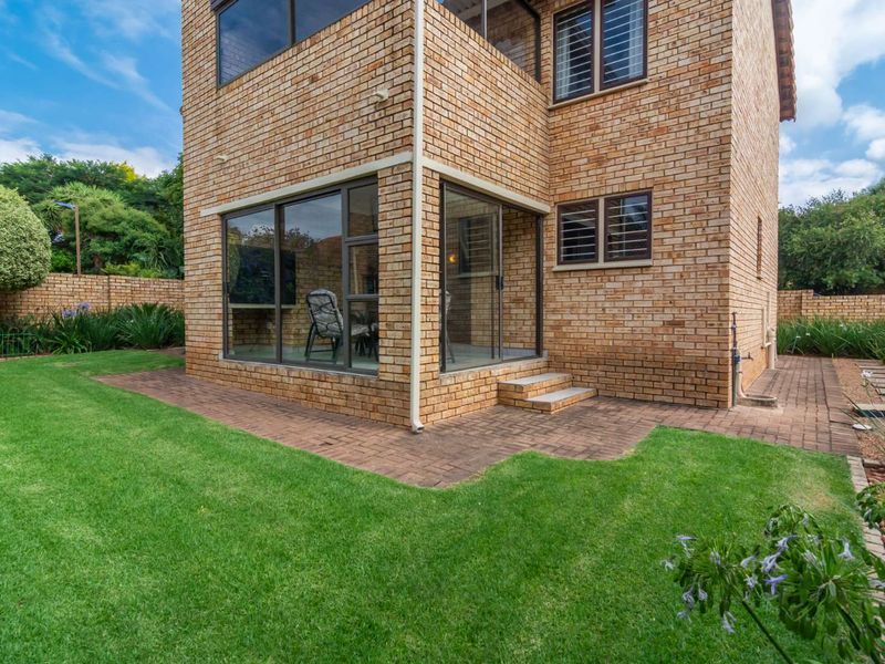 Entertainer's townhouse in family-friendly Ruimsig with large private garden, covered patio and built-in braai, pool with water feature — three bedrooms, three bathrooms and a single garage.