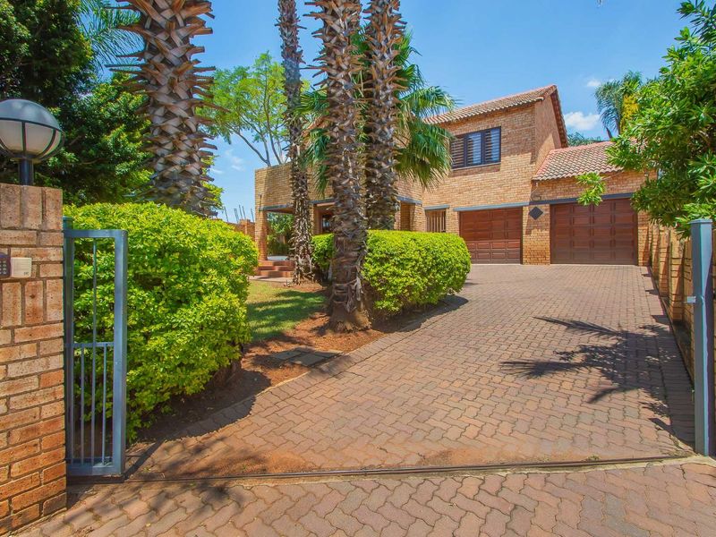 Entertainer's townhouse in Ruimsig, steps from Spur and minutes to Cradlestone Mall — huge wrap-around garden with pool and covered braai patio. Three bedrooms, double garage.