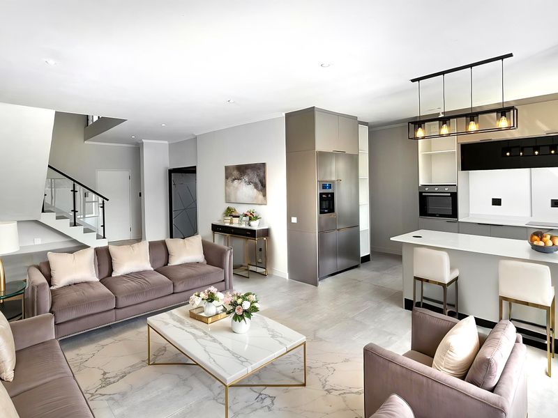 Entertain effortlessly in Bryanston, Sandton's exclusive new double-storey development — modern living with private garden and covered patio with built-in braai, three bedrooms, double automated garage.