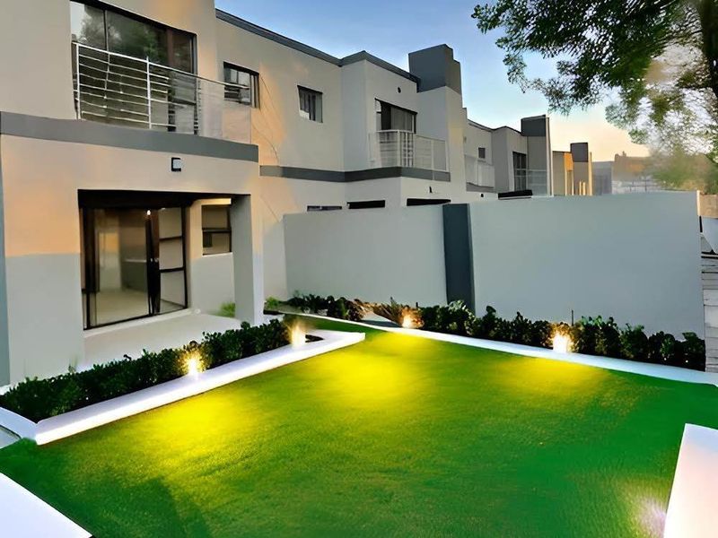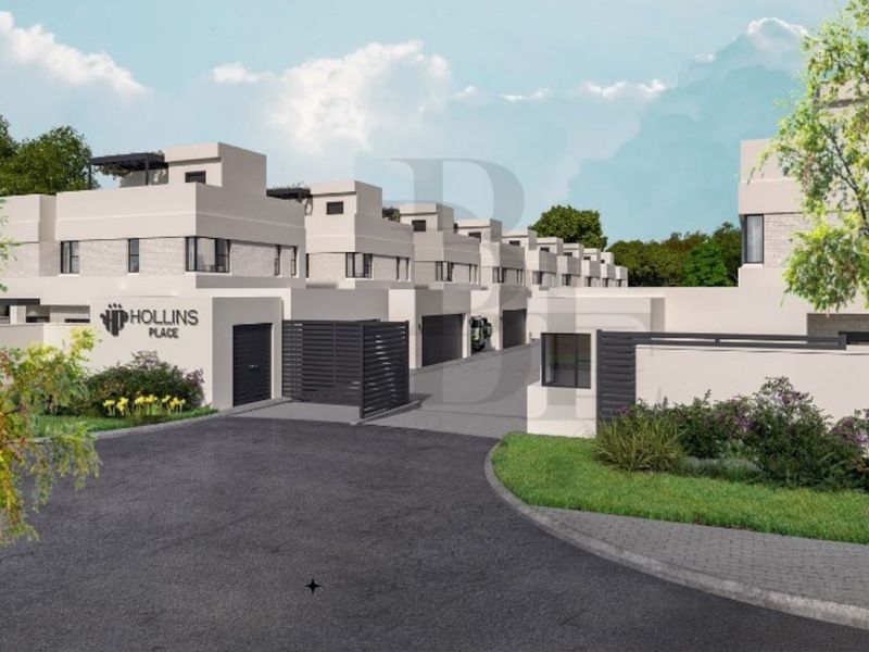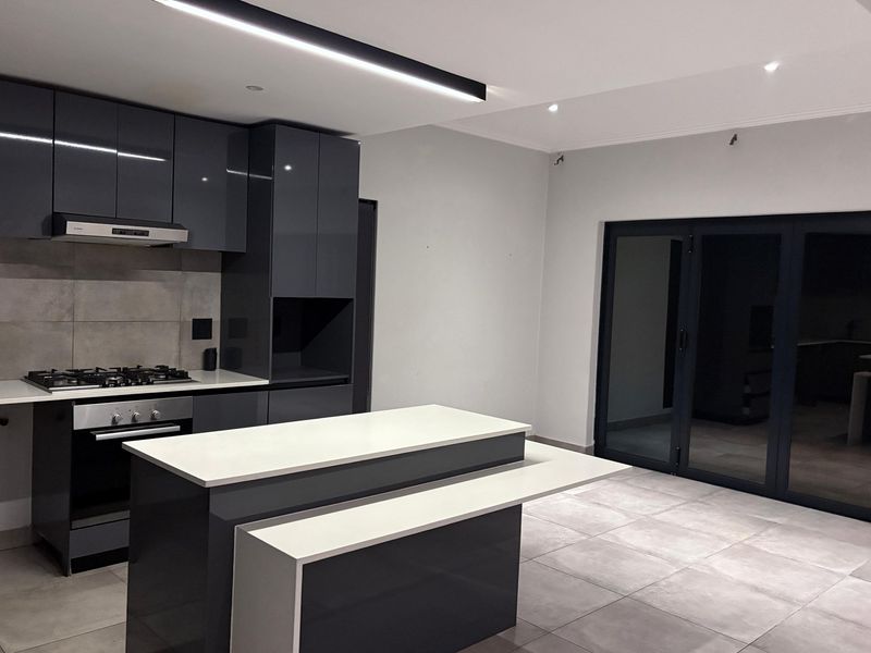 Brand-new modern townhouse in Bryanston East, minutes from Riverside Shopping Centre and Sandton, boasting a covered patio with built-in braai, three en-suite bedrooms and double garage.