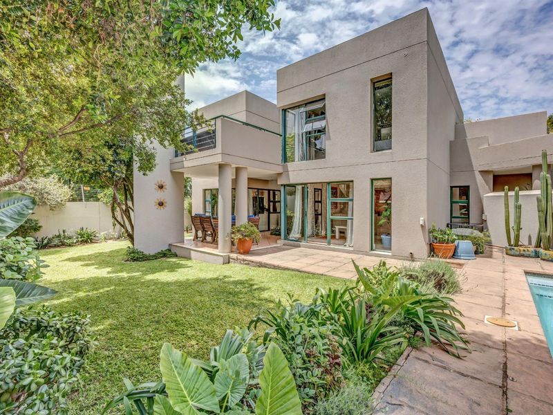 Relaxed family living in the heart of Sandton, minutes from Redhill School and Morningside Mall — private established garden with pool and tree fern, three-bedroom, two-bath, double garage.