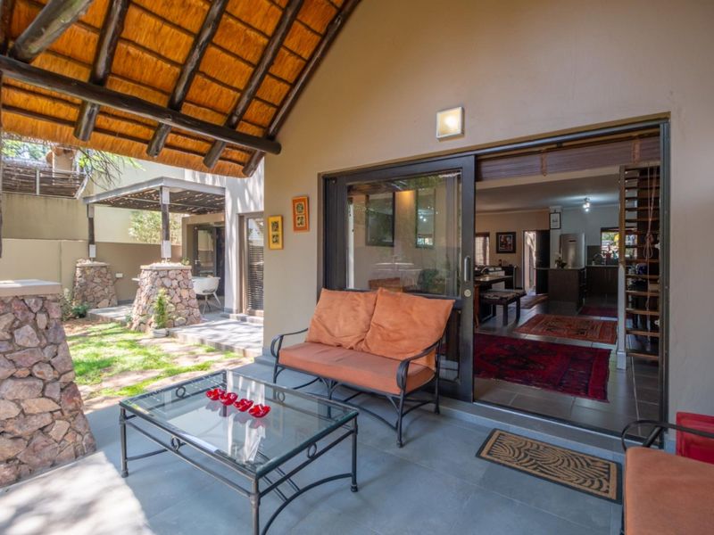 Relaxed Sunning Hill living with an open-plan lounge leading to a covered patio and serene garden views; includes two bedrooms, one bathroom and access to a clubhouse and pool.