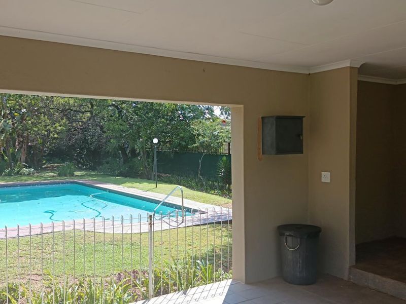 Relaxed Bryanston East living with quick access to Winnie Mandela Drive, schools and malls; covered patio overlooks a lush garden and sparkling pool — three bedrooms, two bathrooms.