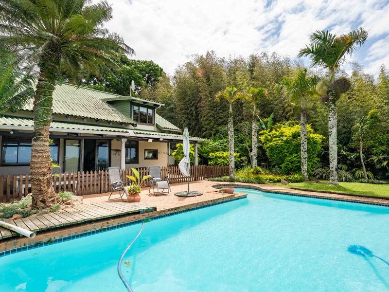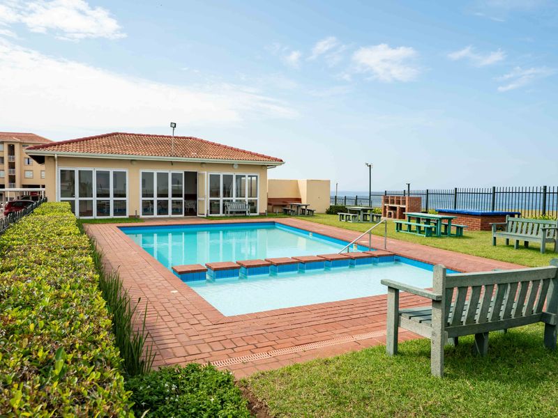 Relaxed seaside living in Amanzimtoti with high ceilings and exposed beams, ocean-view home office, private pool and manicured garden; three bedrooms, two bathrooms and double lock-up garage.