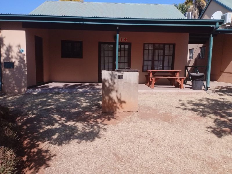Relax in this secure Bela Bela townhouse near schools and shops, with open-plan living, front-patio built-in braai and communal park — two bedrooms, one bath and double covered parking.