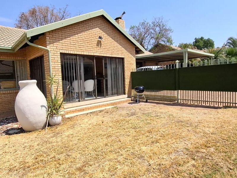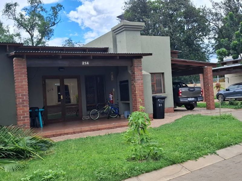 Relax in this secure Bela Bela townhouse near schools and shops, with open-plan living, front-patio built-in braai and communal park — two bedrooms, one bath and double covered parking.