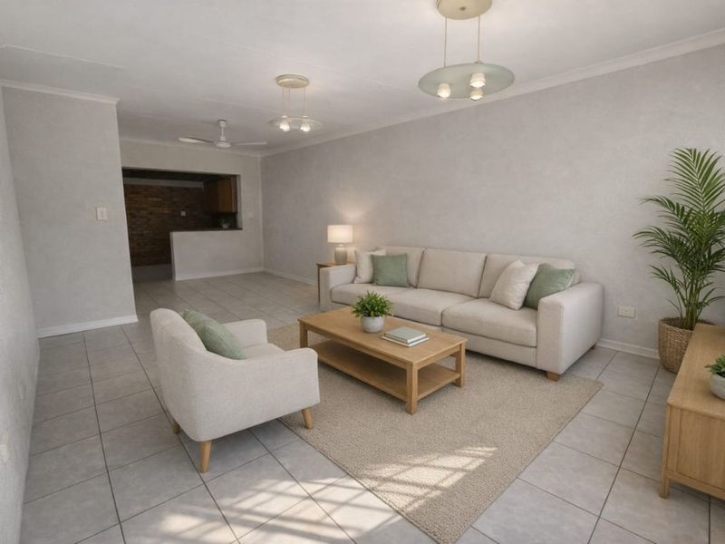 Easy, low-maintenance living in Mopani Park, Bendor — walk to shops and schools; open-plan lounge and fully equipped kitchen flow to a paved courtyard; two bedrooms, one bath, single garage.