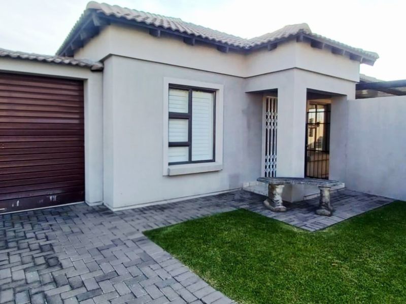 Effortless family living in a tranquil, gated estate — covered braai area overlooks a private garden for weekend gatherings; modern kitchen, three bedrooms, two bathrooms, double garage.
