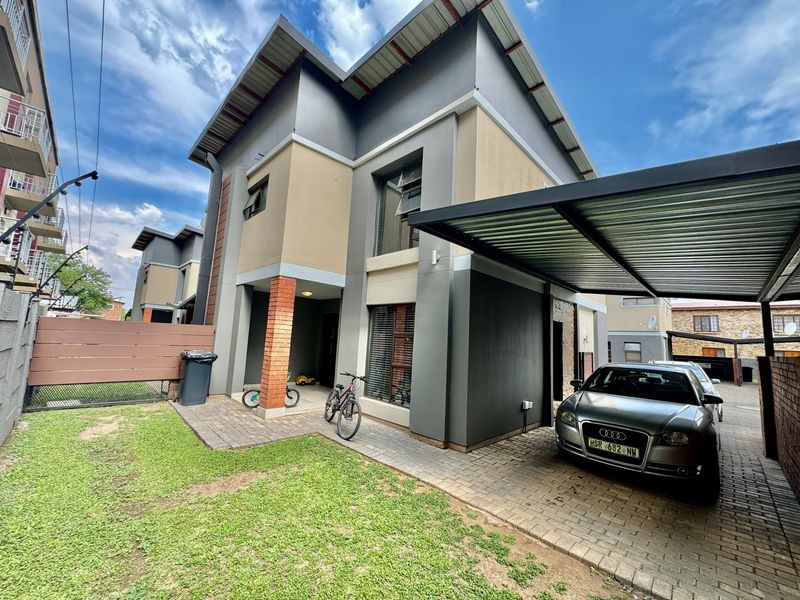Entertain on a sunny patio with built-in braai and private pet garden in a quiet suburb — intimate three-unit complex with modern kitchen, 3 beds, 2 baths, double garage.