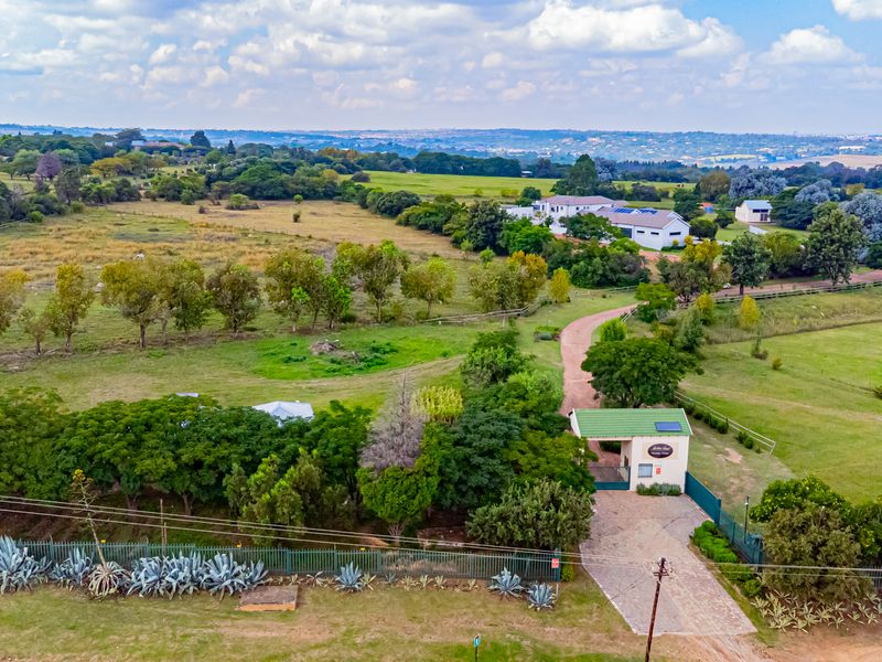Escape to elevated country living with panoramic views in Blue Hills, Midrand — 4.5ha development site with pool, income-producing staff dwellings and strong highway access.