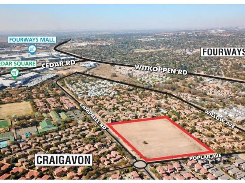 Create vibrant community living steps from Fourways Mall and top schools in Fourways Craigavon, Sandton — 2.11ha development-ready land rezoned Residential 2, approved for up to 60 units.