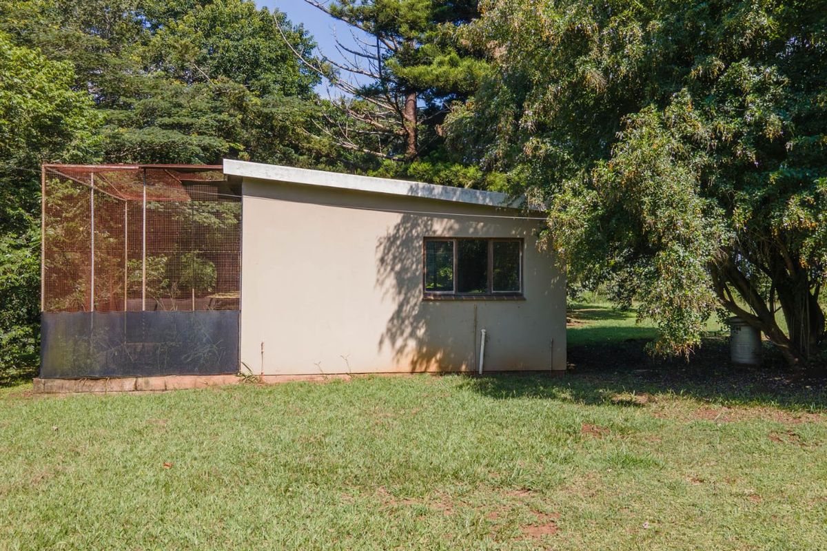 Private Kloof retreat on the Upper Highway — pancake-flat panhandle plot ready to build, no levies, with a bird aviary doubling as practical storage for materials.