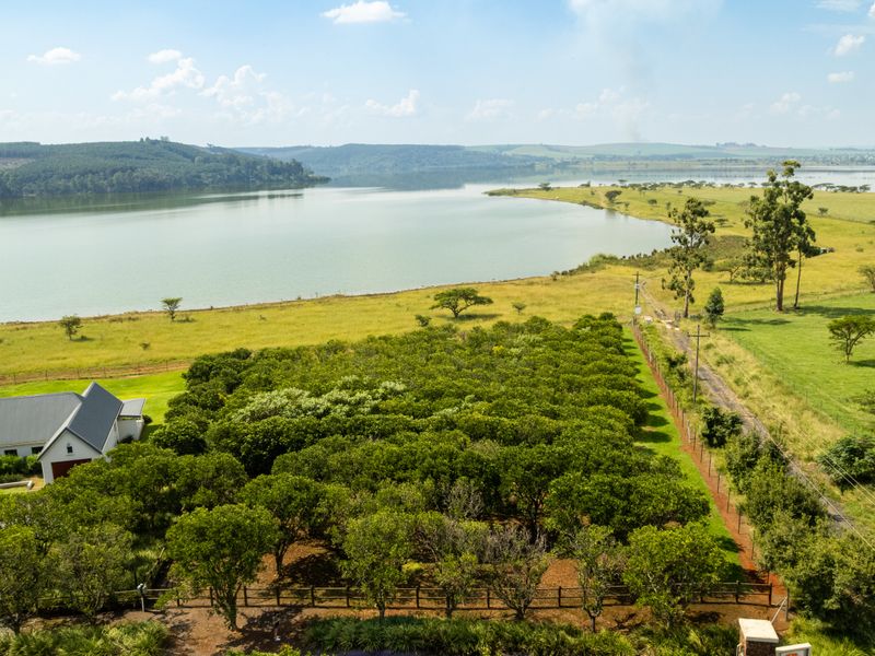 Orchard-lined damfront living in Orangewood Estate — 4,407m² stand overlooking Albert Falls Dam and Khayalami Bay, citrus groves in a boutique 10-stand setting, 30 minutes from Pietermaritzburg.