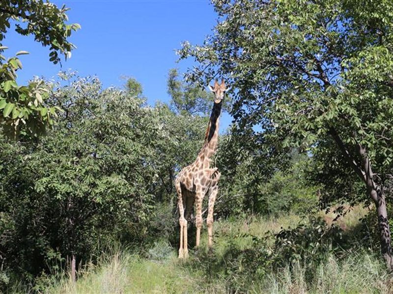 Live peacefully on a 13,090 m² south-facing stand in Thaba Moriri, private wildlife estate with giraffe and zebra; steep slope ideal for a pillar-supported home to capture views.