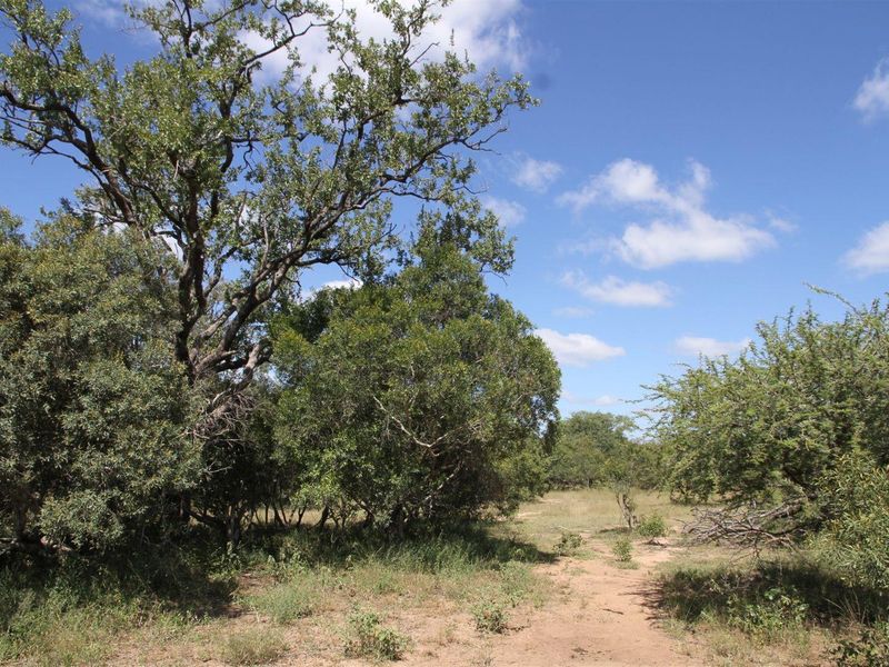Live among roaming wildlife with riverfront bushveld in northern Moditlo near Blue Canyon gate — 1.2ha stand with seasonal river frontage, mature leadwood and marula trees, flat building site.