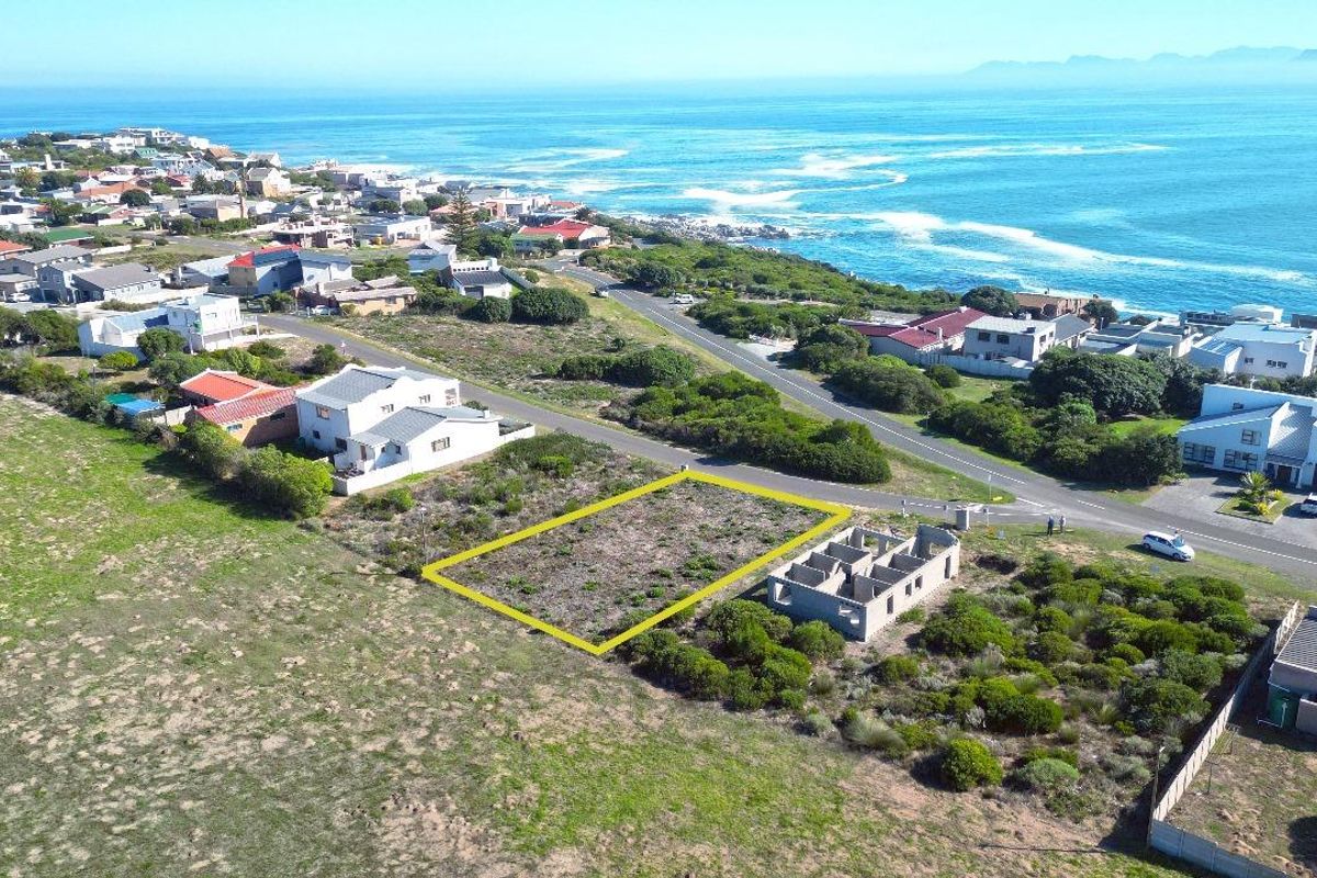 Enjoy dual sea-and-mountain panoramas in De Kelders, just 100m from the cliffs — perfect for front-and-rear living areas to choose your view. 585 m² plot.