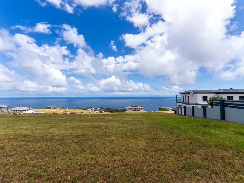 Coastal living with panoramic ocean and Outeniqua Mountain views in secure Le Grand Estate; a 972 m² blank-canvas stand ideal for a custom home, close to town and airport.