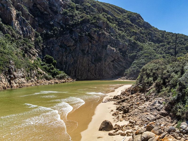 Create your coastal retreat in Le Grand Estate, George — 608 m² slope stand with sweeping Indian Ocean and Outeniqua Mountain views, 3 km from Gwaing River mouth beach.