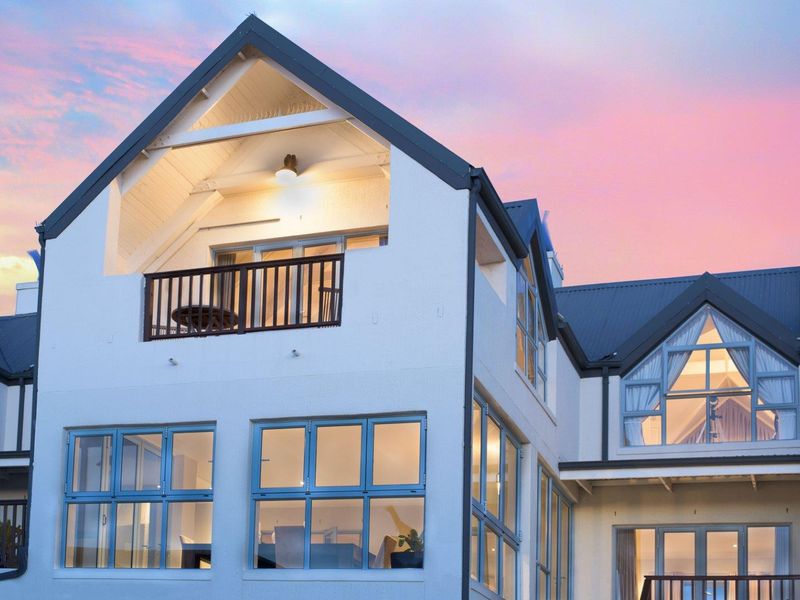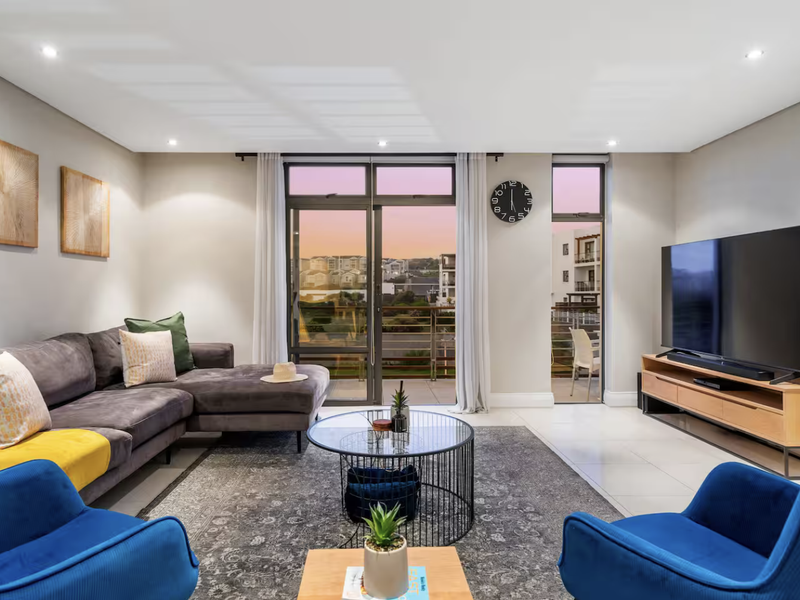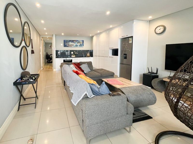 Enjoy Big Bay coastal living with sundowner balcony and Robben Island views; turnkey Airbnb-ready apartment with open-plan kitchen, two en-suite bedrooms, guest loo and double garage.