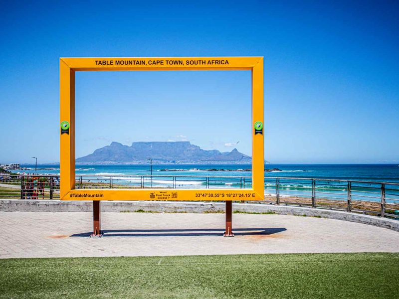 Beachside living in Waves Edge, Big Bay — walk to the shore and cafés, enjoy Table Mountain and ocean views from a large patio with built-in braai; two beds, two baths.