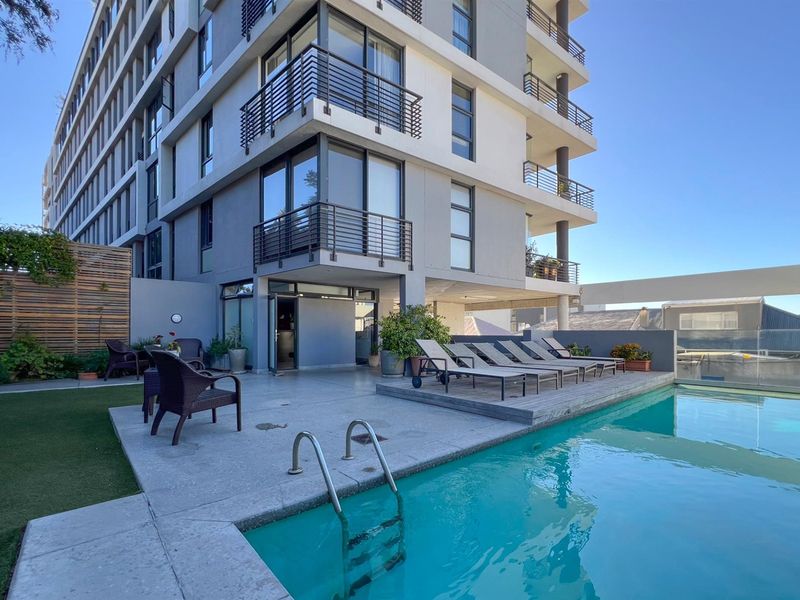 Sunlit Sea Point apartment ideal for coastal entertaining, walking distance to beachfront and Main Road, with wrap-around terraces, splash pool, three en-suite bedrooms, 3.5 baths and two covered parking bays.