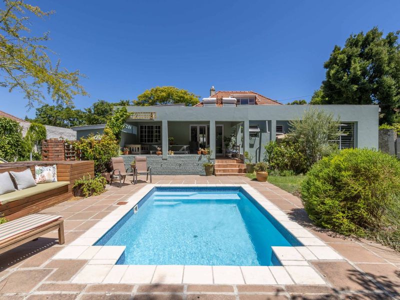 Entertainer's dream in Kenilworth with park-like garden, pool and sun deck — open-plan island kitchen flowing to semi-enclosed patio. Includes separate work-from-home office and three bedrooms.