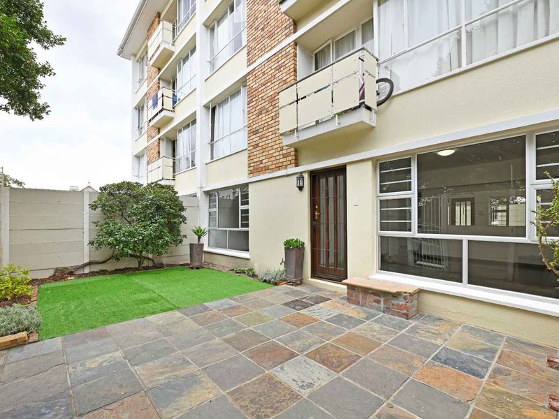 Effortless Kenilworth urban living with shops and eateries nearby; ground-floor apartment features sunlit open-plan living and a partially covered private patio for braais. Two bedrooms, two bathrooms, one parking bay.