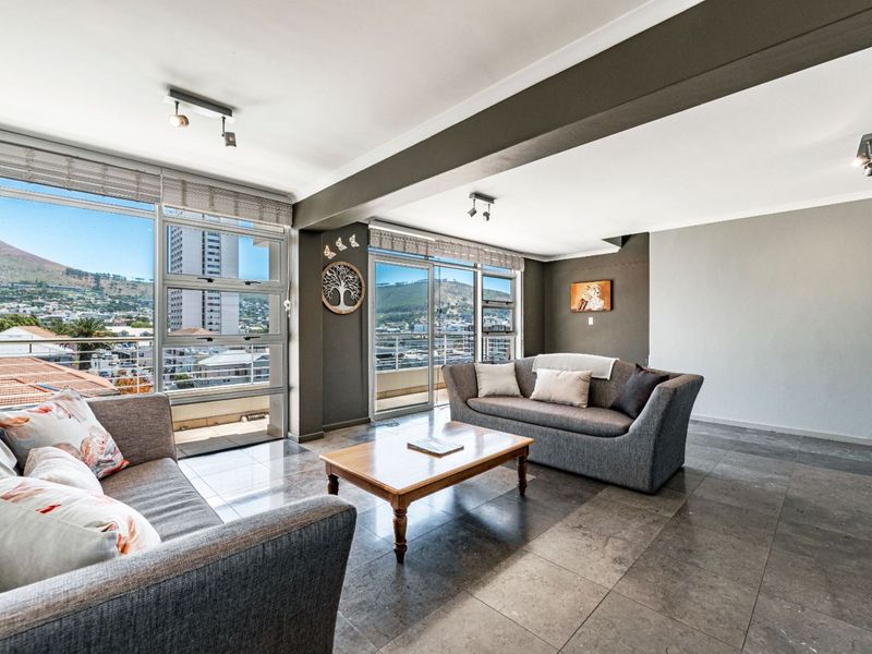 Live city-edge luxury near Gardens Centre and the CBD with sweeping Table Mountain views from a private terrace and balcony; penthouse with two bedrooms, two bathrooms and tandem parking.