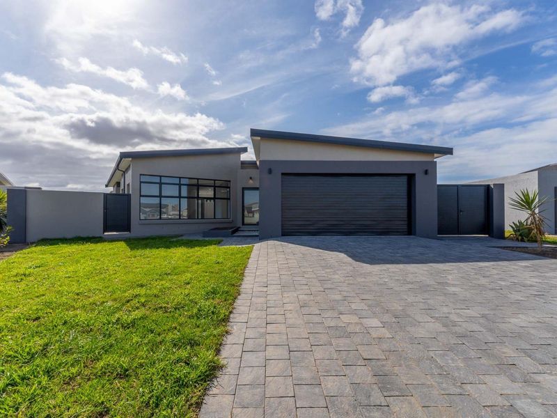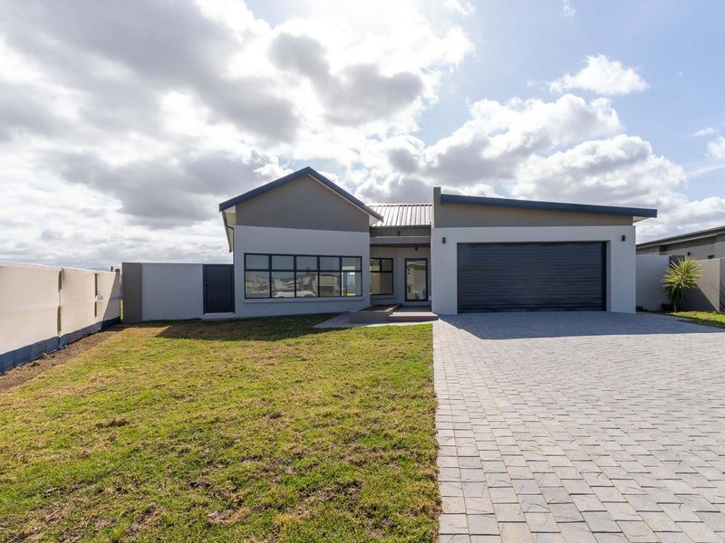 Enjoy relaxed Garden Route living in Le Grand Estate, minutes from a safe beach and George amenities, with Outeniqua Mountain views, modern open-plan design, walled backyard, three bedrooms, two bathrooms.
