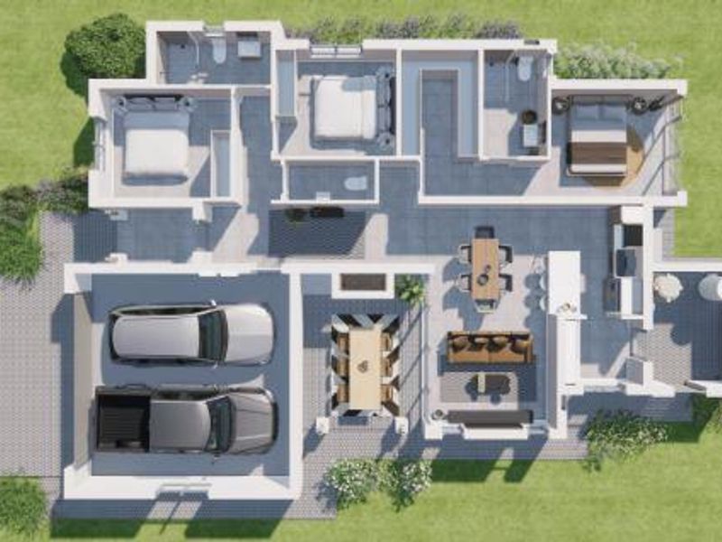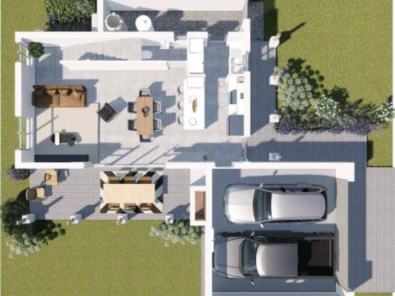 Relaxed family living with seamless open-plan flow and a covered patio with built-in braai overlooking estate green spaces and distant views; three bedrooms, two bathrooms, single garage.