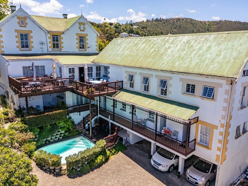 Enjoy hilltop coastal living overlooking the Knysna Estuary and Heads, tucked in a quiet cul-de-sac with a central courtyard, sparkling pool and lush gardens — ideal investment or guesthouse.
