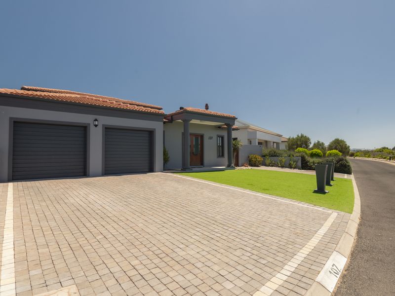 Coastal entertaining lifestyle steps from Langebaan beach in Calypso Beach estate, with open-plan living and built-in braai, four en-suite bedrooms and double automated garage.