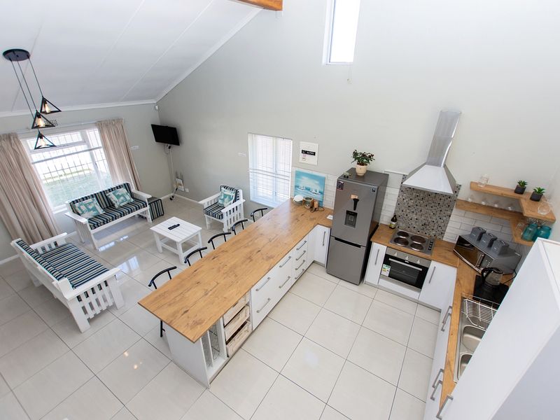Relax with coastal lifestyle in Middedorp, Langebaan — airy open-plan living, hardwood countertops kitchen and a loft with private balcony and sea views. Three bedrooms and two bathrooms.