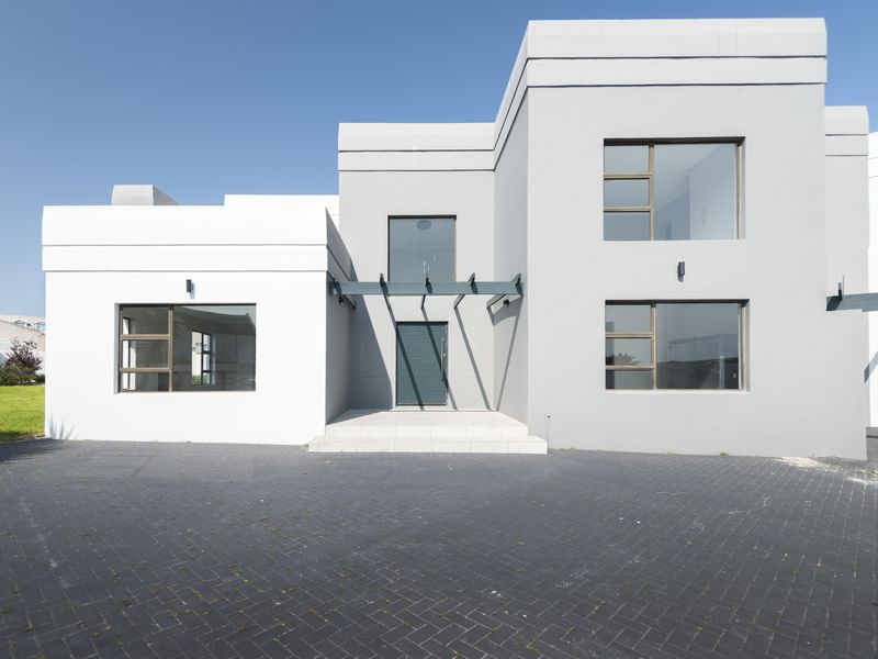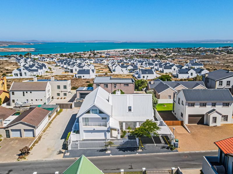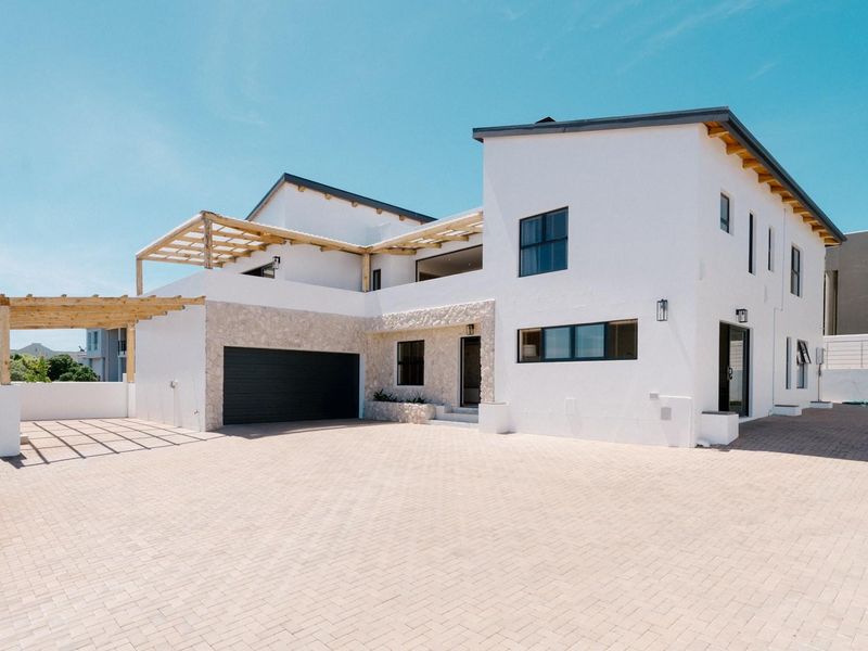 Entertainer's coastal retreat in Myburgh Park, Langebaan — the landmark Real White House with glossy epoxy floors, bar and garden jacuzzi, plus four en-suite bedrooms and double garage.