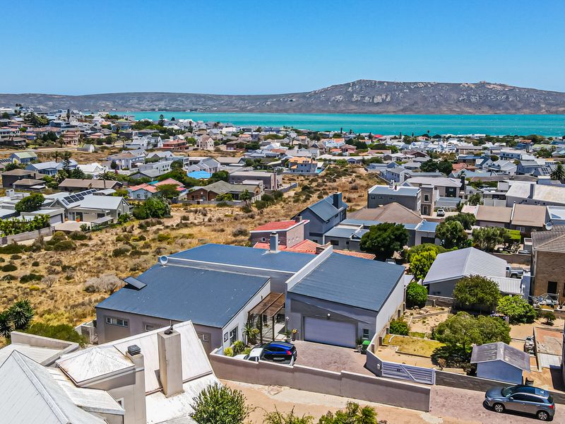 Coastal living in Myburgh Park, Langebaan with balcony sea views, high open trusses, open-plan living and built-in braai, small pool and outdoor entertaining — three bedrooms, 2.5 bathrooms.