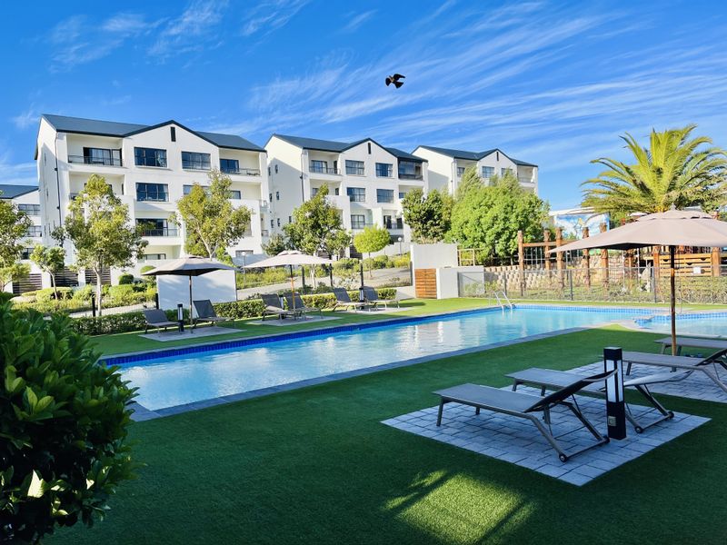 Relaxed lifestyle in De Zicht Lifestyle Estate with uninterrupted Table Mountain views and sunlit balcony, modern open-plan kitchen, on-site gym, pool and concierge—one bedroom, one bath, covered parking.